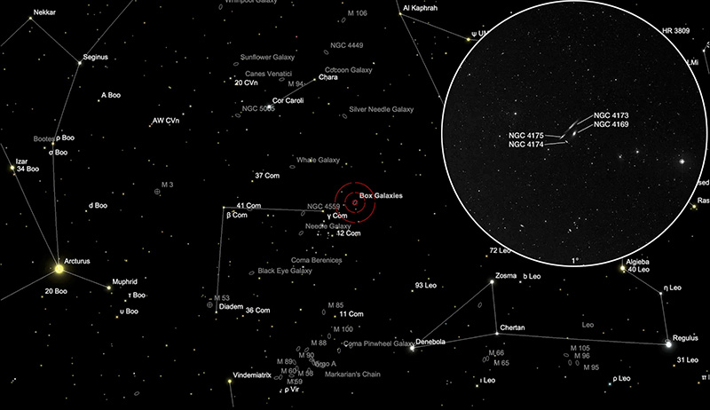 The galaxy group Hickson 61 (HCG 61) also bears the nickname «The Box» (not to be confused with NGC 6309, Box Nebula). The name is appropriate because the four galaxies form approximately a rectangle to one another.