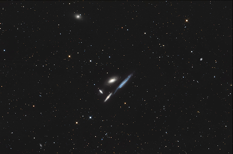 NGC 4174 at the southern corner is by far the smallest of the four galaxies, but still much brighter than NGC 4173. In this spiral galaxy, too, we are almost looking at the edge, because the angle between the axis of rotation and the viewing direction is about 72 degrees. It shows the same escape speed as NGC 4169, so also the same distance.