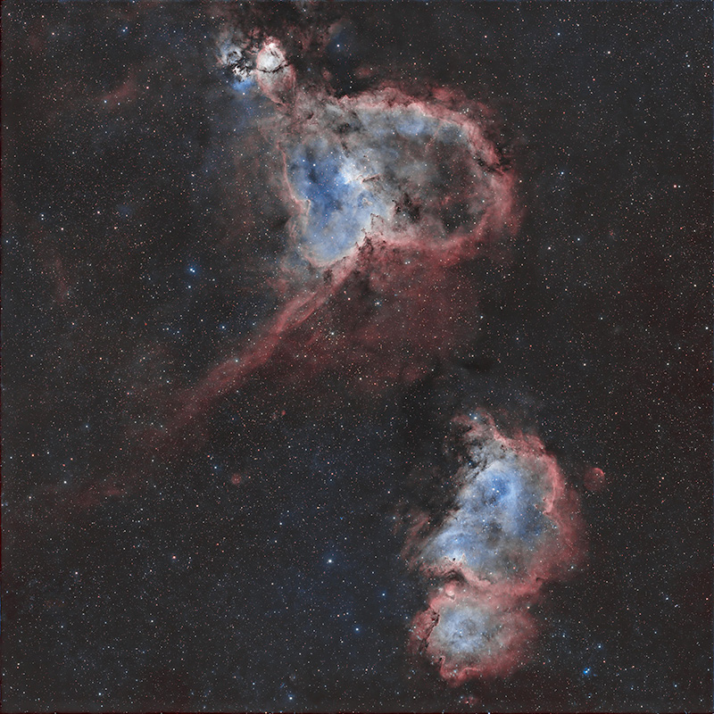 is located about 6 degrees southeast of the star ε Cassiopeiae, but can also be found by starting from the Perseus Double Cluster and moving about 4-5 degrees north-northeast. It is paired with another vast nebula, known as IC 1848. It is a very large HII region, estimated to be about 7,500 light-years away from us. Its main characteristic is the presence of two large, apparently empty areas of different sizes, giving the nebula a "heart" shape. Within it lies a system of small, loosely concentrated open clusters, responsible for the nebula's ionization. The most notable of these is Melotte 15, which contains some stars about 50 times more massive than the Sun, plus other smaller ones and a microquasar ejected millions of years ago. W4 has a shell-like structure and is the largest of the three main nebulae in the complex; at its center lies the open cluster IC 1805, a designation sometimes also used for the entire associated nebula. IC 1805 actually forms the central part of the large Cassiopeia OB6 association; the brightest stars in the cluster are blue dwarfs, 24 of which have a mass greater than 10 M☉ and are between 1 and 3 million years old. Among these blue stars are nine of spectral class O, enclosed within a radius of about 10 pc, while the total radius of the open cluster is about 18 pc. Of these O-class stars, radial velocity and Gaussian curve studies have revealed that six are double stars; among these, one, HD 15558, appears to be a triple star. Multiple episodes of star formation are active near the nebula; images obtained in H-α have revealed an expanding superbubble of ionized hydrogen, 1200 pc in size, emerging from the galactic plane. Its age, approximately 10-20 million years, suggests it originated from the stellar wind of an early generation of massive stars. From this region, more than 30 molecular clouds and globules are emerging, dispersed in the surrounding space, as seen above. Their presence suggests that a giant molecular cloud once existed in the region, which later dissolved due to an initial intense episode of star formation.