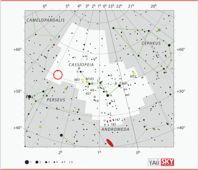 The nebula can be detected about 8 degrees southeast of the star ε Cassiopeiae, but it can also be seen starting from the Double Mass of Perseus and moving about 5 degrees in a northeast direction; it pairs with another vast nebula, known as IC 1805. To be able to locate it, you need a telescope with a large diameter, not so much for the size, since the nebula is quite extensive, but for its weakness. A long-lasting photo or a CCD camera instead reveals the object with some ease. The entire complex of nebula visible in this area is circumpolar from most regions of the northern hemisphere; the best months to observe it are from October to April.