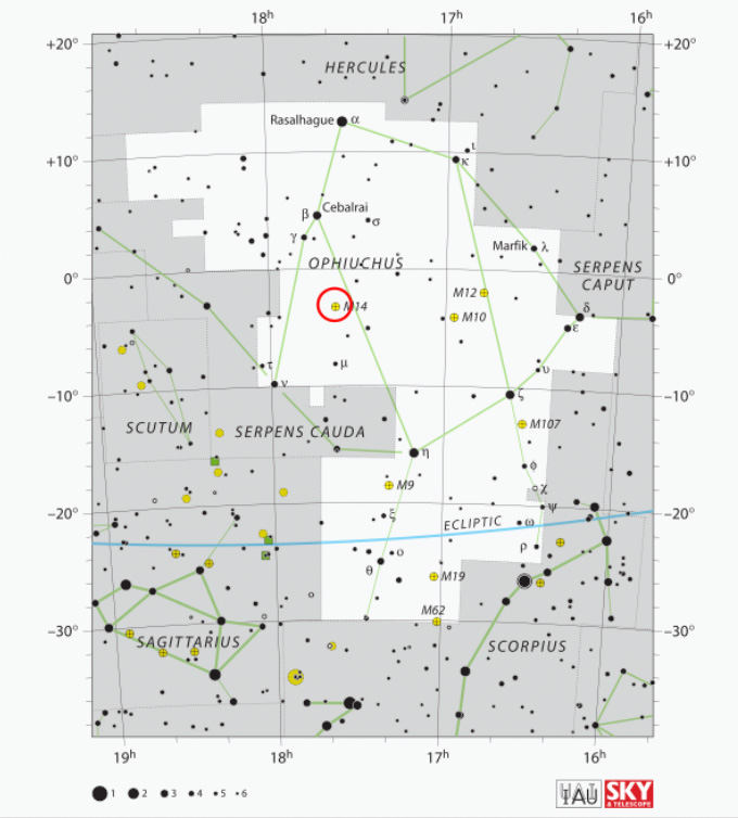 M 14 (also known as NGC 6402) is a globular cluster visible in the constellation Ophiuchus. M14 is somewhat difficult to locate due to its isolation: it can be located halfway between the stars β Ophiuchi and η Ophiuchi; due to its distance, the cluster is difficult to resolve into stars.