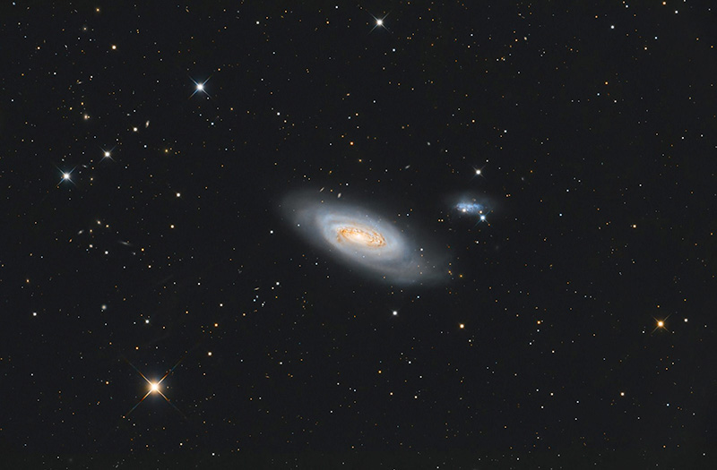 M 90 (also known as NGC 4569) is a spiral galaxy visible in the constellation of Virgo; it is one of the eight galaxies found and catalogued by Charles Messier on 18 March 1781 in the Coma-Virgo region, together with the globular cluster M92 of Hercules. M90 is located in a region of the sky without reference stars, between the constellations of Virgo and Coma Berenices; it is one of the brightest galaxies of the Virgo group. M90 was first described by Charles Messier in 1781 as a starless nebula; William Herschel indicated it as a large and bright spot in the center, where there is a well-defined nucleus. The most accurate description comes from Father Heinrich Ludwig d'Arrest, who described it as an elliptical cloud whose nucleus shines like a twelfth magnitude star, of which it would also possess the appearance; its dimensions are 7' x 2'. M90 is one of the largest spiral galaxies (9.5x4.5') of the Virgo Cluster. It has spiral arms, very narrow and uniformly bright, which appear to be completely "fossilized", in the sense that there does not seem to be any star formation in progress, with the sole exception of the inner region of the disk, near some dark lines of dust. Its interstellar medium has probably been largely stripped away by the intense tidal forces present within the cluster in which it is located; other theories suggest that it was swept away by multiple supernova explosions in the core region, where star formation is still active. J.D. Wray has proposed that this galaxy is evolving toward a state similar to that of M64, and then becoming a lenticular system (S0). Its distance is approximately 60 million light-years and it has an apparent magnitude of 9.3. Since it is approaching us at a speed of 383 km/s, it must be moving at a particularly high speed, close to 1,500 km/s, through the Virgo Cluster in our direction, and it is possible that it is on the verge of escaping from the cluster; according to some sources it has already left the cluster and is now much closer to us. Only one other Messier galaxy, M86, has a faster approach velocity.