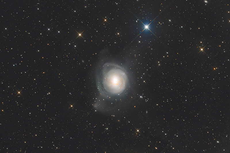 NGC 2655 is a lenticular galaxy located in the constellation of Camelopardalis at a distance of 63 million light years from Earth and is a member of the homonymous group of galaxies NGC 2655. It is a Seyfert galaxy, a type of galaxy with an active galactic nucleus with spectral lines characteristic for the presence of highly ionized gas. The galaxy has asymmetric dust streaks in the center, tidal arms, large amounts of neutral hydrogen gas and probably there was a recent merger event with another galaxy. Indeed, from the set of characteristics of NGC 2655, the hypothesis has been advanced that the galaxy has had various merger episodes with other galaxies. The study in the infrared band highlighted the presence of a faint central bar. A trail of gas is directed towards the nearby small galaxy UGC 4714. NGC 2655 is larger in diameter than the Milky Way, reaching about 195,000 light-years[3]. NGC 2655 is the brightest member of the NGC 2655 group that contains, among others, the galaxies NGC 2715, NGC 2591 and NGC 2748. In 2011, the supernova SN2011B was observed, a type Ia supernova with a peak magnitude of 12.8.