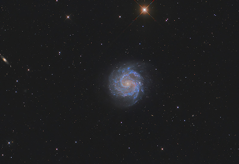 NGC 3184 is a spiral galaxy located approximately 25 million light-years away from us, in the constellation of Ursa Major. It is one of the brightest galaxies in the constellation, easily identifiable less than a degree west of the star μ Ursae Majoris, of third magnitude. Its spiral arms, visible face-on, are well recognizable even in small instruments; inside them are clearly visible two H II regions, catalogued separately with the acronyms NGC 3180 and NGC 3181. NGC 3184 is particular for the great abundance of heavy elements and for the supernovae exploded inside it: 1921B of magnitude 13.5, 1921C of 11.0, 1937F of 13.5, 1999gi of 14.5, and the PSN J10181930+4125392 of 15.9, in 2010 an object was observed, 2010dn, which turned out to be an LBV.