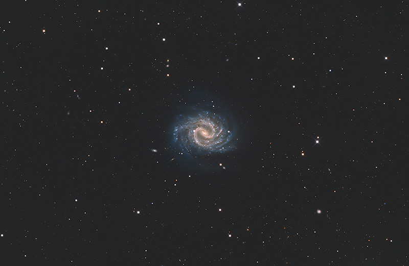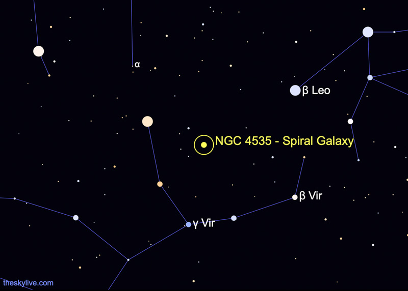 NGC 4535 is a barred spiral galaxy located some 54 million light years from Earth in the constellation Virgo. It is a member of the Virgo Cluster of galaxies and is located 4.3° from Messier 87. The galactic plane of NGC 4535 is inclined by an angle of 43° to the line of sight from the Earth. The morphological classification of NGC 4535 in the De Vaucouleurs system is SAB(s)c, which indicates a bar structure across the core (SAB), no ring (s), and loosely wound spiral arms (c). The inner part of the galaxy has two spiral arms, which branch into multiple arms further away. The small nucleus is of type HII, meaning the spectrum resembles that of an H II region.