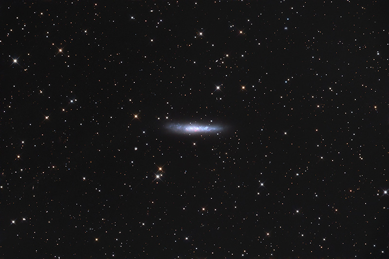 NGC 784 is a barred spiral galaxy of the Magellanic type, seen edge-on and located in the constellation of Triangulum, at a distance of about 14 million light-years from our Milky Way.