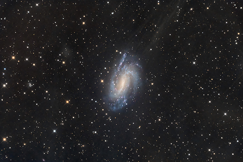NGC 925 is a barred spiral galaxy located in the constellation of Triangulum, about 9.3 Mpc away. The measurement of the distance, very accurate, was possible thanks to the discovery of numerous Cepheid variables by the Hubble Space Telescope. Studies concerning the structure and star formation in this galaxy show various asymmetries: from the surveys it emerged that the northern arm is more developed than the southern one, which is more fragmented, suggesting an interaction with another galaxy in the past, and bringing NGC 925 closer to irregular galaxies than to barred ones. NGC 925 is part of the NGC 1023 group and was discovered by William Herschel in 1784.