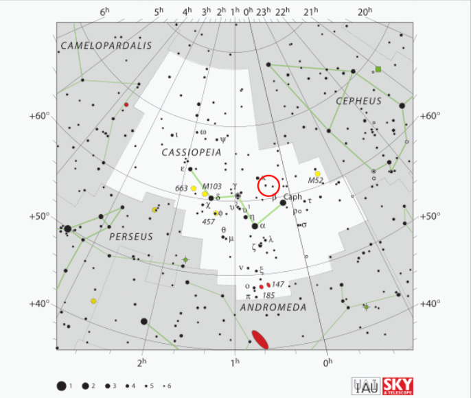 AR: 00h 21m 16s - Dec: +61° 43′ 30″ |