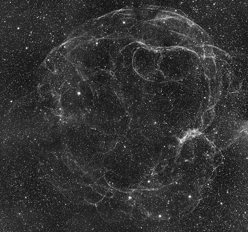 Simeis 147 (also known as Sh2-240 or Spaghetti Nebula) is a famous supernova remnant visible in the constellation of Taurus, on the border with Auriga. The nebula appears in the form of very delicate filaments, denser on the south-eastern side and much more rarefied on the western one; they were created by an ancient supernova that exploded about 1470 parsecs (4800 light years) from the Sun, on the Perseus Arm. If the distance measurements are correct, the object would have a real size of 160 light years. The supernova would have exploded about 40,000 years ago, leaving a pulsar towards the southern corner of the object; the star that originated this object was probably a member of the Auriga OB1 association and was therefore linked to the open cluster M36, from which it would have escaped before ending its life cycle. Previous estimates of its distance had given a value of 800 parsecs (about 2600 light-years), thus placing it within the Orion Arm.