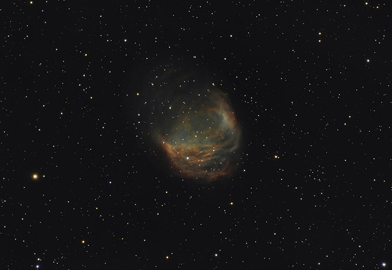 | Comment | Abell 21 (also known as the Medusa Nebula or Sh2-274) is a planetary nebula visible in the constellation of Gemini. It is observed in the southern part of the constellation, on the border with Canis Minor; it can be identified with the help of 6 Canis Minoris, a fourth magnitude star from which the nebula is just 1°20' in a NNW direction. Thanks to its size and relatively high brightness, it is an easy subject for amateur astrophotography, if you have a medium-high power telescope. The most favorable period for its observation in the evening sky is from December to May and observers in the Northern Hemisphere are slightly more advantaged, although the low declination of the cloud makes it visible from all populated areas of the Earth. The nebula appears as a tangle of bright filaments oriented to form a sort of semi-conference open on the northwestern side; Its appearance makes it very similar to a supernova remnant, to the point that it was initially considered as such. Later, through measurements of its emissions and its expansion speed, it was discovered that it belongs to the class of planetary nebulae, although in an advanced stage due to its age, estimated at around 8800 years. The central star, a white dwarf, is located in a particular position on the HR Diagram, below the white dwarf branch, almost on the edge of the band where the white main sequence stars are found.