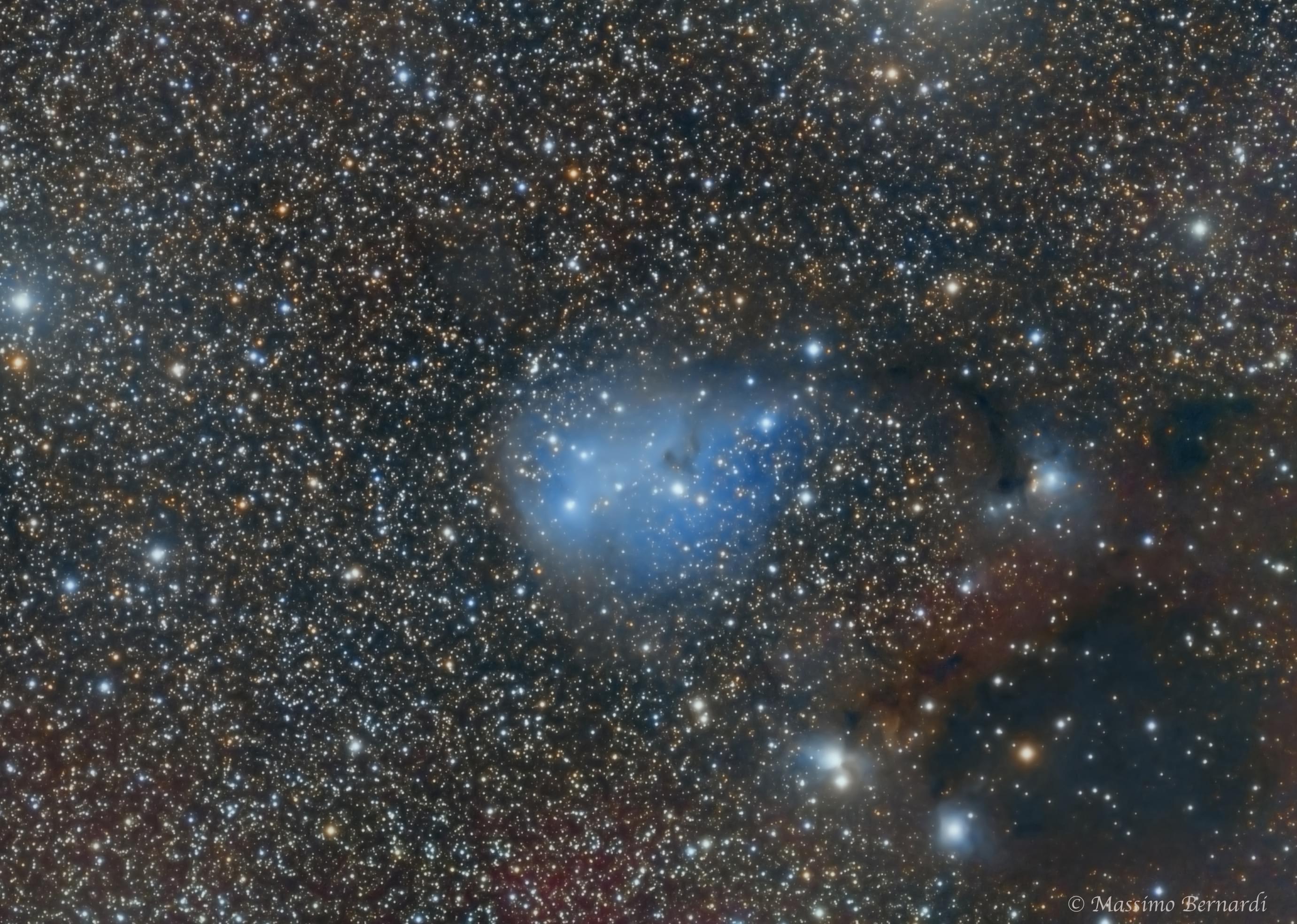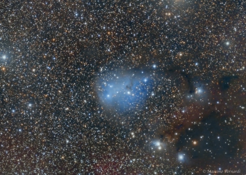IC 2169 is a large reflection nebula visble in the Unicorn constellation. Constitutes one of the central regions of the association of massive stars known as Monoceros R1. It's located in the northern parte of the consettaltion, close to the Cone Nebula and the "Christmas Tree" cluster. Estimated distance is 2480 l.y. The association Monoceros R1 has some blue stars of spectral class B and about 7000 M⊙