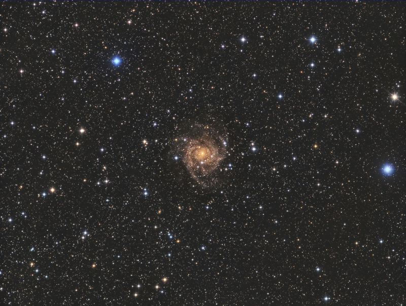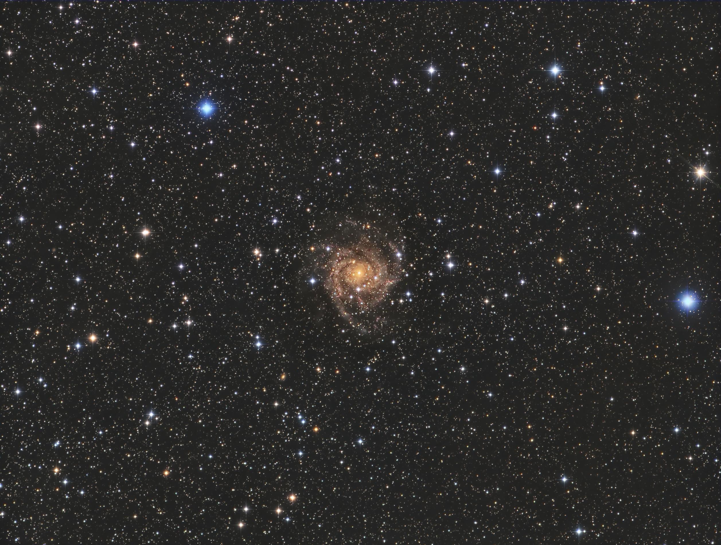 | Comment | IC 342 (also known as Caldwell 5) is an intermediate spiral galaxy in the constellation Camelopardalis relatively close to the Milky Way. Despite its size and actual brightness, its location in dusty areas near the galactic equator makes it difficult to observe, leading to the nickname "The Hidden Galaxy", though it can readily be detected even with binoculars. The dust makes it difficult to determine its precise distance; modern estimates range from about 7 Mly to about 11 Mly. The galaxy was discovered by William Frederick Denning in 1892. It is one of the brightest in the IC 342/Maffei Group, one of the closest galaxy groups to the Local Group. Edwin Hubble first thought it to be in the Local Group, but it was later determined not to be a member. In 1935, Harlow Shapley found that it was wider than the full moon, and by angular size the third-largest spiral galaxy then known, smaller only than the Andromeda Galaxy (M31) and the Triangulum Galaxy (M33). (Modern estimates are more conservative, giving the apparent size as one-half to two-thirds the diameter of the full moon). It has an H II nucleus.