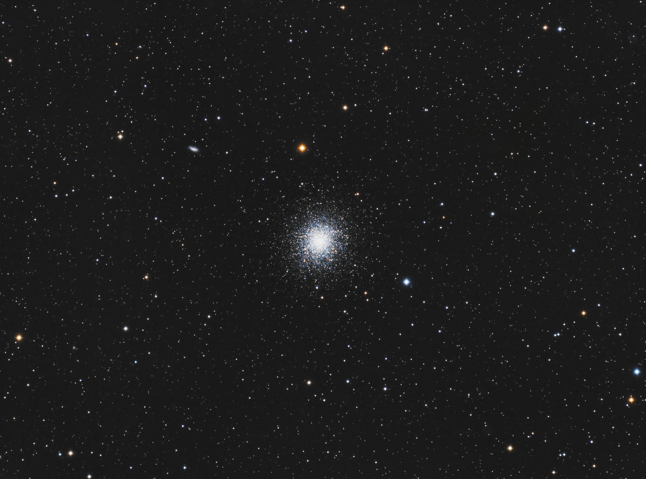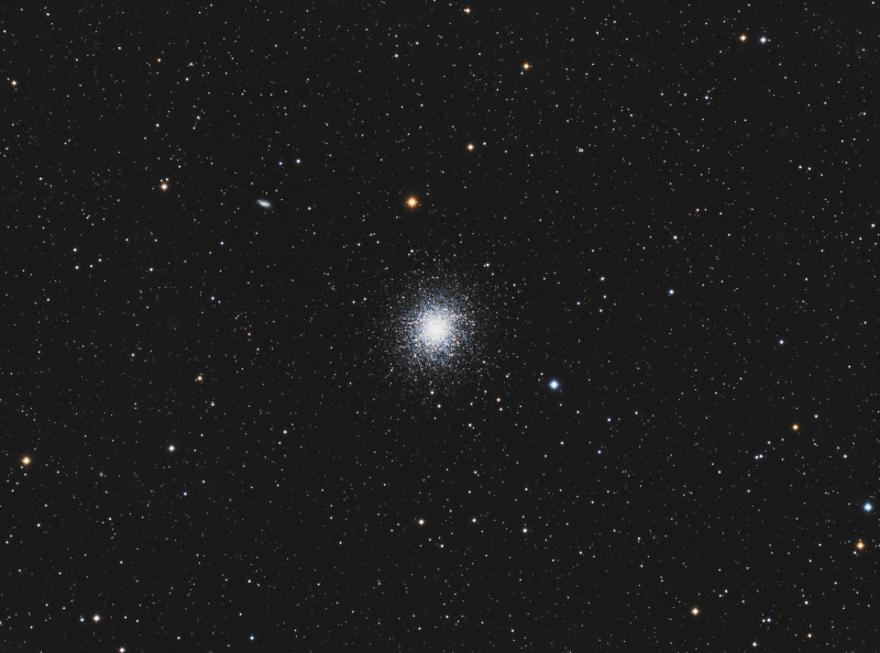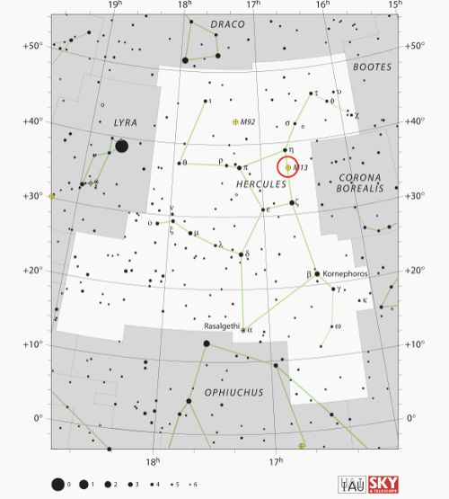 | Comment | Messier 13 (M13), also designated NGC 6205 and sometimes called the Great Globular Cluster in Hercules or the Hercules Globular Cluster, is a globular cluster of about 300,000 stars in the constellation of Hercules. M13 was discovered by Edmond Halley in 1714, and cataloged by Charles Messier on June 1, 1764. Charles had a list of more than a 100 objects that later became known as the Messier Catalog. The French astronomer mistook these objects for comets, but compiled them into a list to help future scientists. Nearby is NGC 6207, a 12th magnitude edge-on galaxy that lies 28 arc minutes directly north east. A small galaxy, IC 4617, lies halfway between NGC 6207 and M13, north-northeast of the large globular cluster's center. M13 is about 145 light-years in diameter, and it is composed of several hundred thousand stars, the brightest of which is a red giant, the variable star V11, with an apparent visual magnitude of 11.95. M13 is 22,200 light-years away from Earth. The Arecibo message of 1974, which contained encoded information about the human race, DNA, atomic numbers, Earth's position and other information, was beamed from the Arecibo Observatory radio telescope towards M13 as an experiment in contacting potential extraterrestrial civilizations in the cluster. While the cluster will move through space during the transit time, the proper motion is small enough that the cluster will only move 24 light years, only a fraction of the diameter of the cluster. Thus, the message will still arrive near the center of the cluster