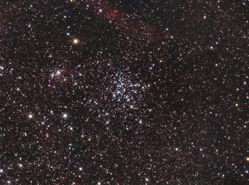 | Comment | Messier 38 (also known as M38 or NGC 1912) is an open cluster in the constellation of Auriga. It was discovered by Giovanni Batista Hodierna before 1654 and independently found by Le Gentil in 1749. Open cluster M36 and M37, also discovered by Hodierna, and often grouped together with M38. Distance is about 1.066 kpc (3,480 ly) away from Earth. The cluster's brightest stars form a pattern resembling the Greek letter Pi or, according to Webb, an "oblique cross." At its distance of 1066 pc., its angular diameter of about 20 arc minutes corresponds to about 4.0 parsecs (13 light years), similar to that of its more distant neighbor M37. It is of intermediate age at about 290 million years. From the population of about 100 stars, this open cluster features a prominent yellow giant with the apparent magnitude +7.9 and spectral type G0 as its brightest member. This corresponds to an absolute magnitude of -1.5, or a luminosity of 900 Suns. For comparison, the Sun would appear as a faint magnitude +15.3 star from the distance of M38.