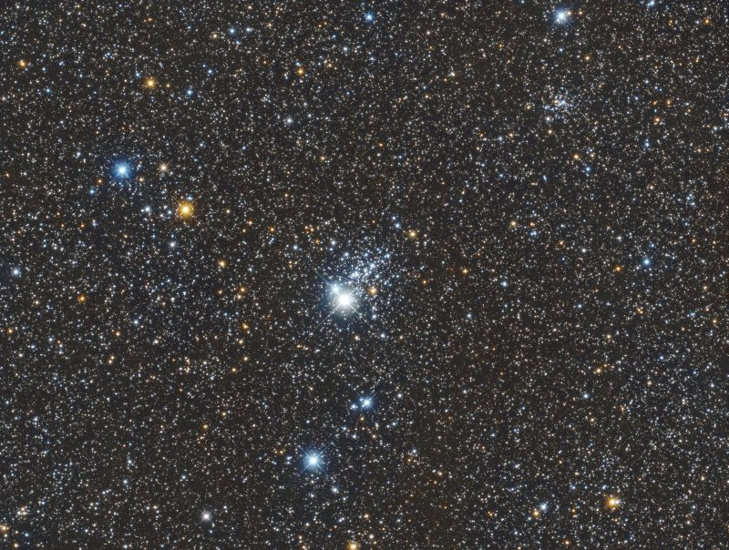 | Comment | NGC 457 (also known as the Owl Cluster, the ET Cluster, or Caldwell 13) is an open star cluster in the constellation Cassiopeia. It was discovered by William Herschel in 1787, and lies over 7,900 light yearsaway from the Sun. It has an estimated age of 21 million years. The cluster is sometimes referred by amateur astronomers as the Owl Cluster, Kachina Doll Cluster, the ET Cluster (due to its resemblance to the movie character) or the "Skiing Cluster". Two bright stars, magnitude 5 Phi-1 Cassiopeiae and magnitude 7 Phi-2 Cassiopeiae can be imagined as eyes. The cluster features a rich field of about 150 stars of magnitudes 12-15.